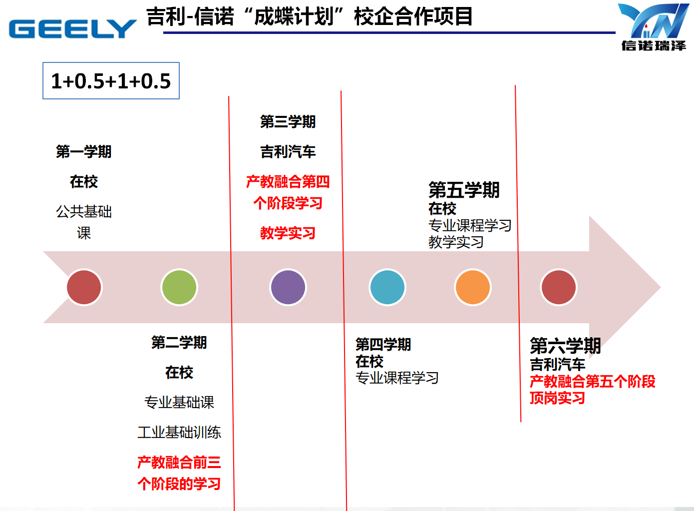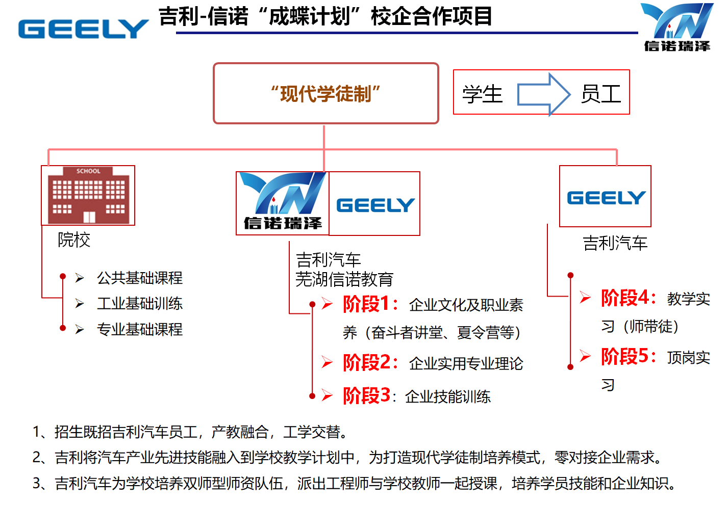 吉利-信諾“成蝶計(jì)劃”校企合作項(xiàng)目,秉承“銜接學(xué)校與企業(yè)最后一公里“的理念,吉利汽車、蕪湖信諾教育設(shè)備有限公司、中高職院校共同培養(yǎng)吉利汽車“零對(duì)接”的高技能人才。項(xiàng)目特點(diǎn)一是招生即招工,解決學(xué)生高質(zhì)量就業(yè)問題,二是將汽車產(chǎn)業(yè)先進(jìn)元素融入到教學(xué)計(jì)劃中,解決高質(zhì)量培養(yǎng)問題,三是共同培養(yǎng)“雙師型”師資隊(duì)伍,解決高質(zhì)量師資問題。