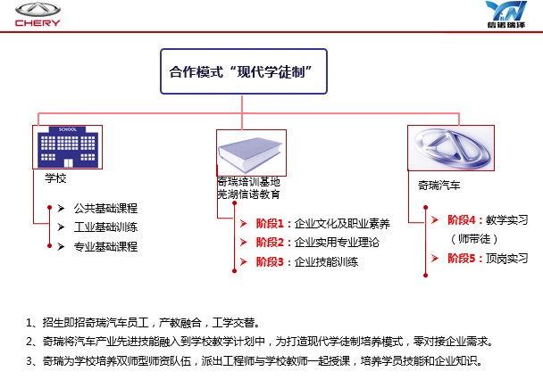 近幾年來,奇瑞汽車快速發(fā)展,對高素質(zhì)勞動者和技術(shù)技能人才需求迫切,為滿足奇瑞公司的人才需求,奇瑞人力資源部和蕪湖信諾職校(奇瑞人才培養(yǎng)基地)經(jīng)詳細研討,制定了現(xiàn)代學(xué)徒制的校企合作模式。
