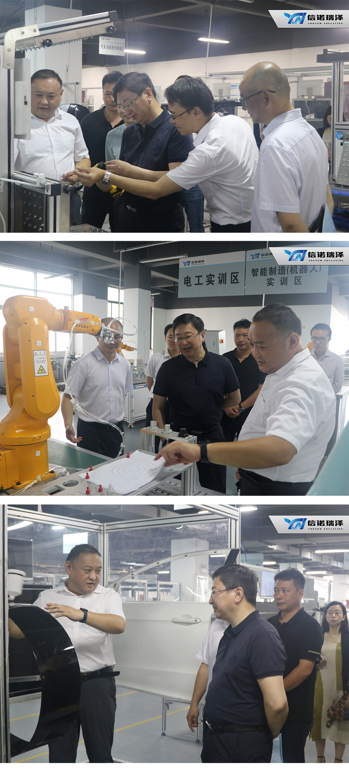 在三大實訓基地參觀中,重點對汽車制造與裝配實訓基地和智能制造實訓基地進行了詳細了解,公司研發(fā)總監(jiān)陸斌對各實訓設備的功能作用和課程體系一一進行了詳細的介紹,贊賞我們把技術工人的實訓做到了實處,做的了細處,并鼓勵我們多跟附近的高?;?,形成學生踏出校門前就進行技能訓練,改變“就業(yè)難”的狀況,將人力資本進行最大的開發(fā),滿足現(xiàn)在的用工模式,在蕪湖乃至全省形成職業(yè)培訓的典范。