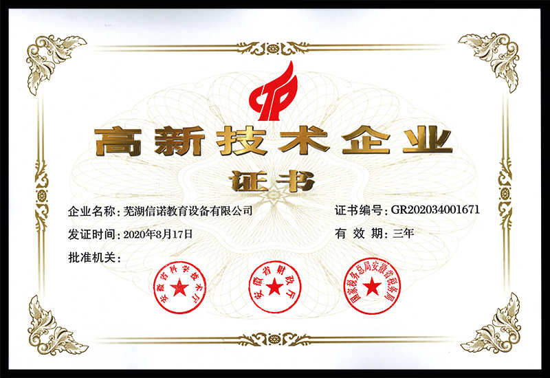 蕪湖信諾教育設(shè)備有限公司坐落在安徽省蕪湖市,是一家從事教育培訓(xùn)課程開(kāi)發(fā)、教學(xué)設(shè)備研發(fā),集生產(chǎn)、銷售和服務(wù)為一體的高新技術(shù)企業(yè),是蕪湖市招商引資項(xiàng)目。截止到2018年7月,公司獲得三十項(xiàng)國(guó)家產(chǎn)品專利。